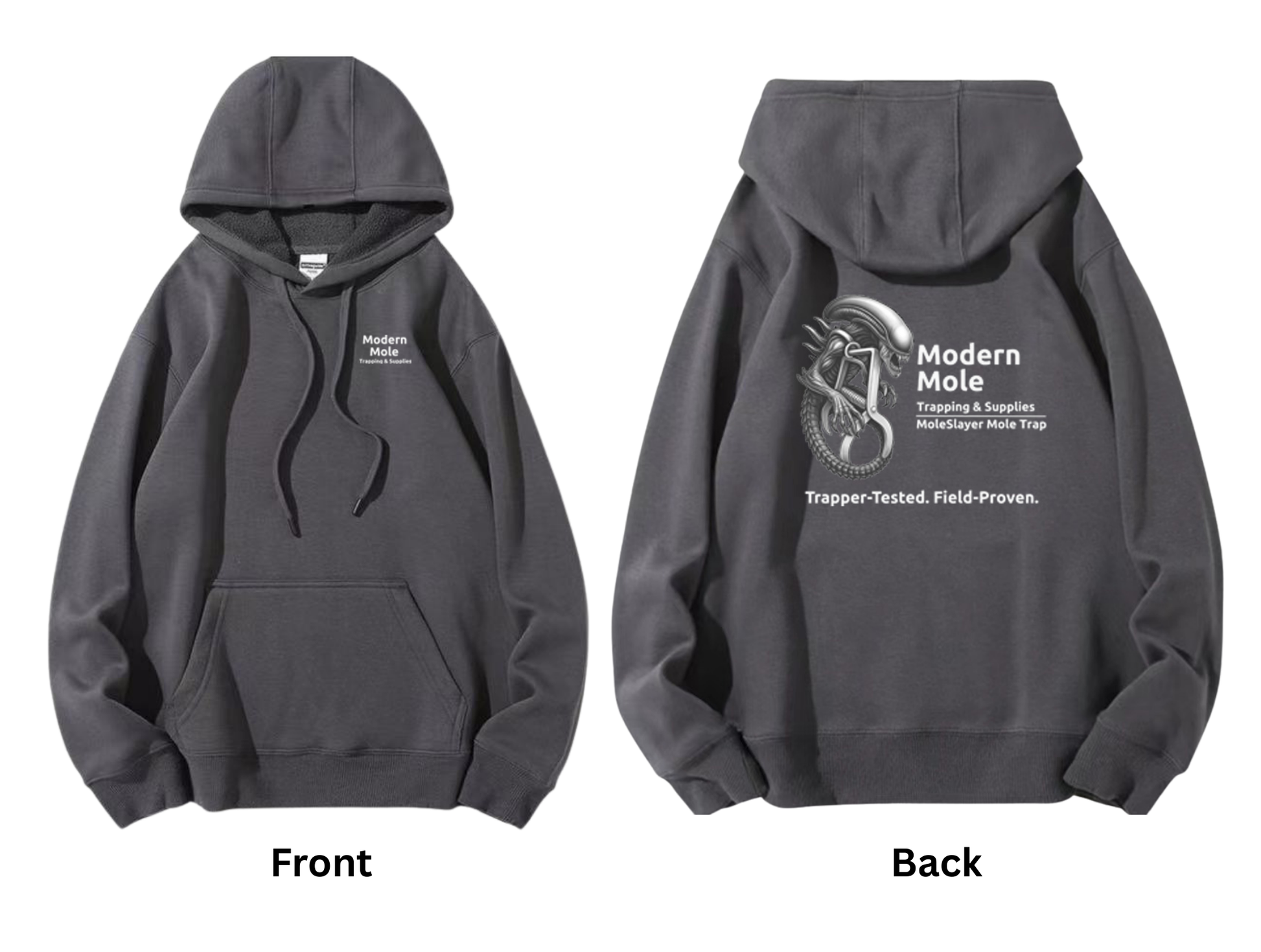 Stay warm, comfortable, and stylish with the Modern Mole Trapping & Supplies dark grey pullover hoodie, featuring crisp white lettering across the front and a full logo on the back. Designed for everyday wear on and off the job, this hoodie is the perfect blend of durability and comfort.