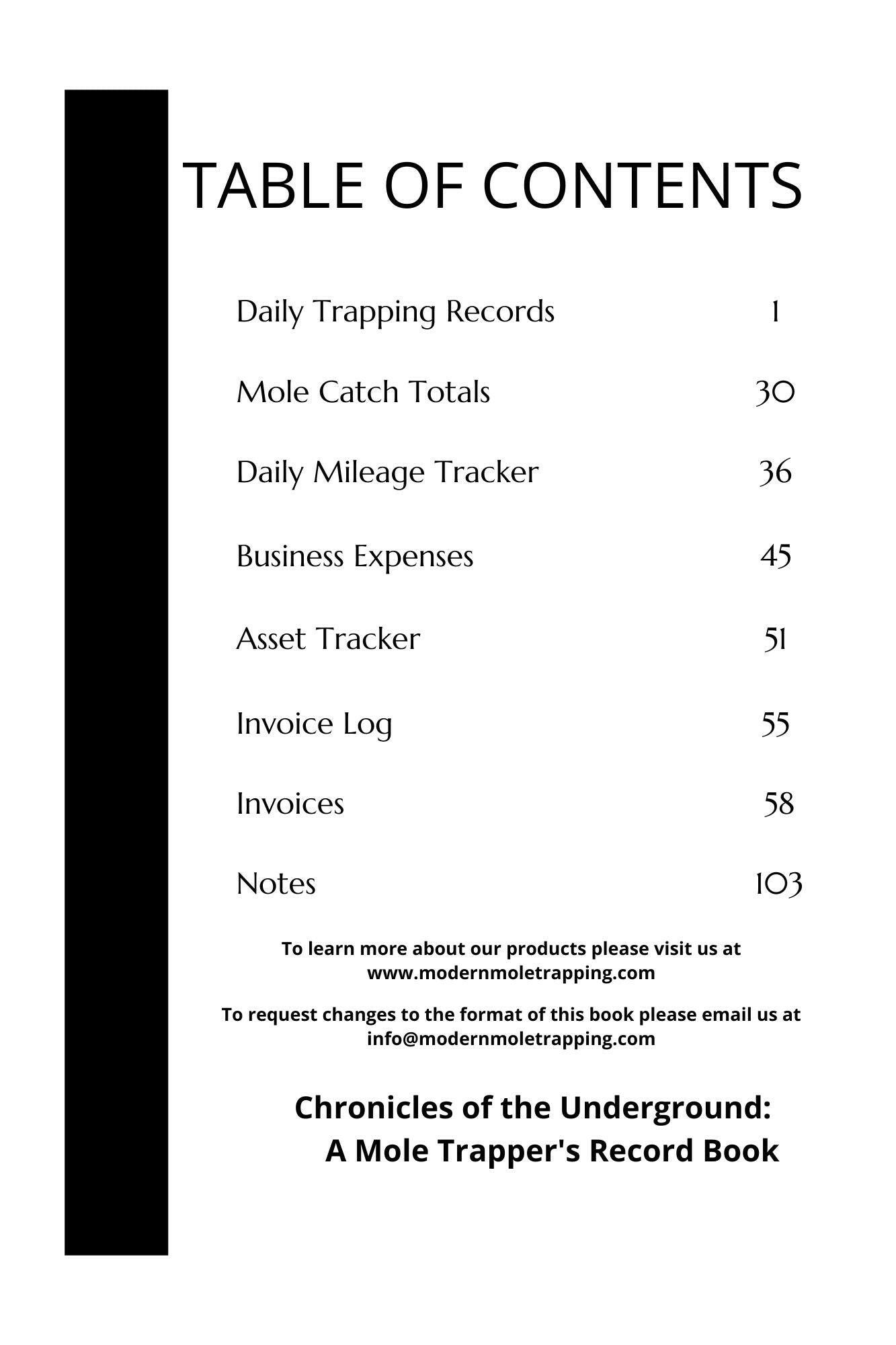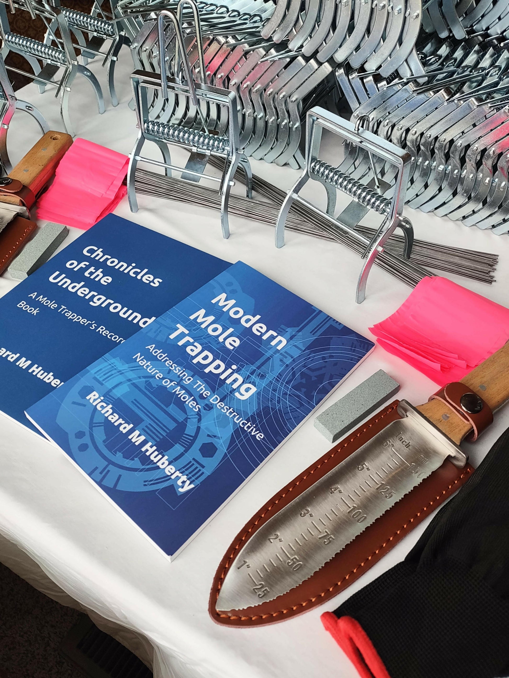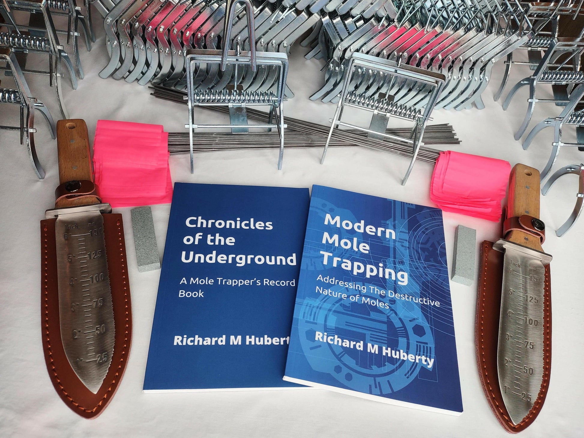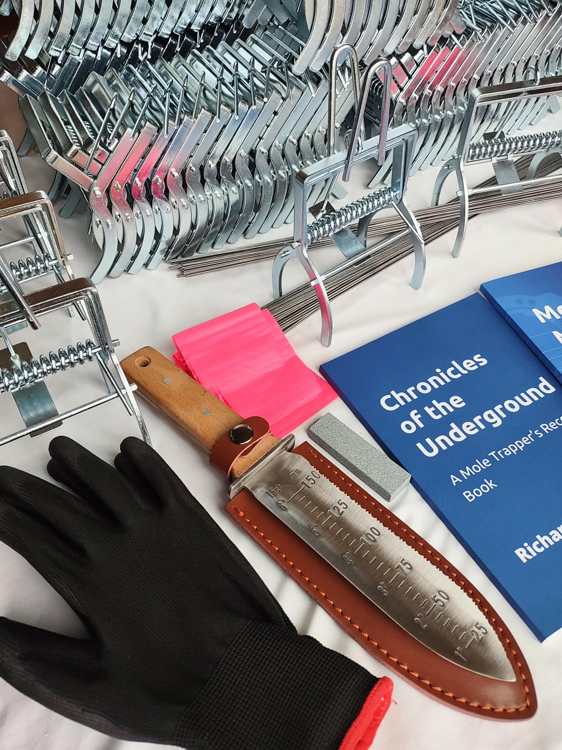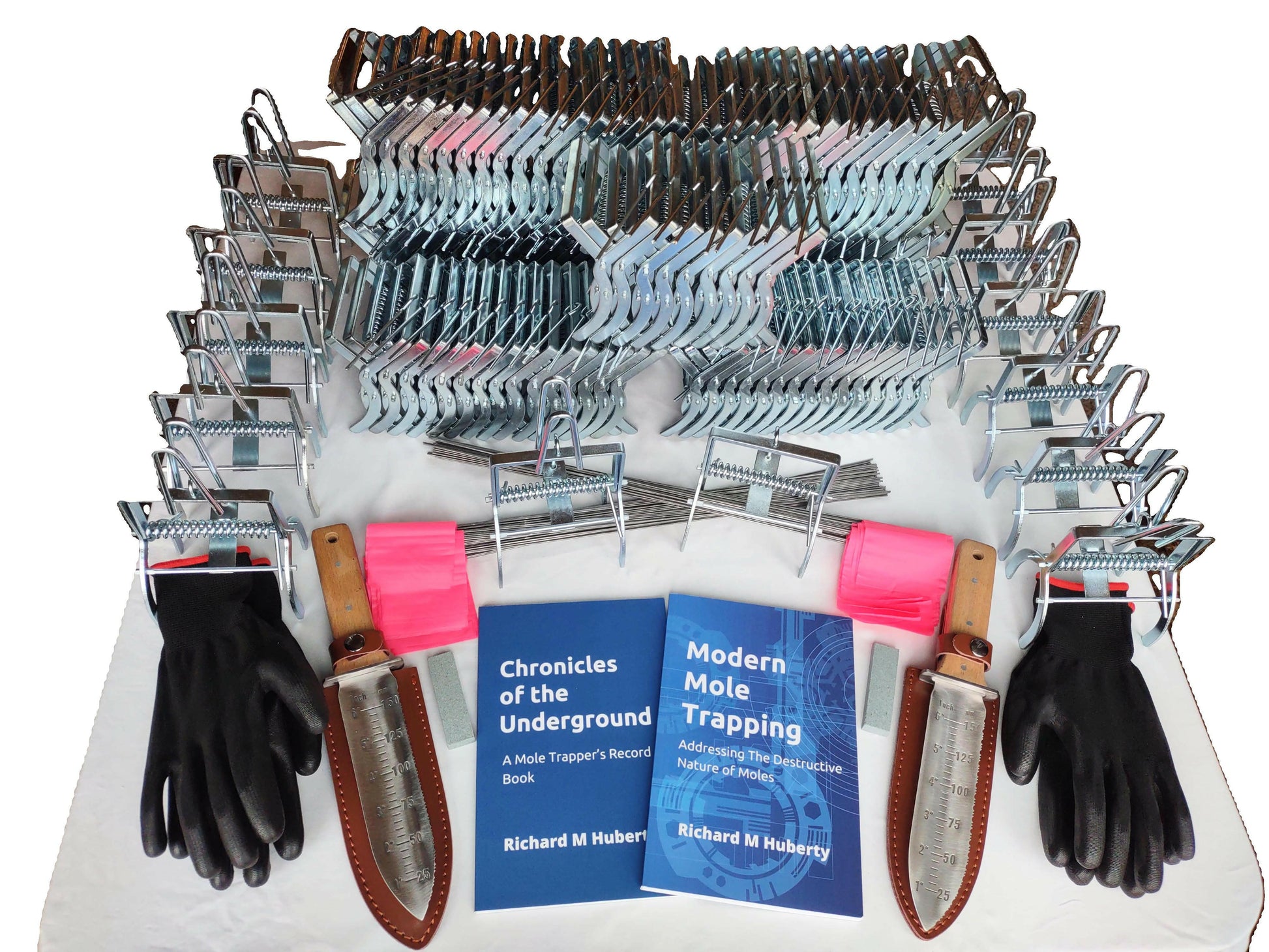 1 Modern Mole Trapping Book, 1 Chronicles of the Underground Book, 100 MoleSlayer Mole Traps, 12 MoleSlayer Mole Traps with Setting Handles, 2 Hori Hori Mole Knives with case and sharpening stones, 125 high visibility marking flags (2.5" x 3.5") with 15" staff lengths, and 2 pairs of reusable nitrile mole trapping gloves.